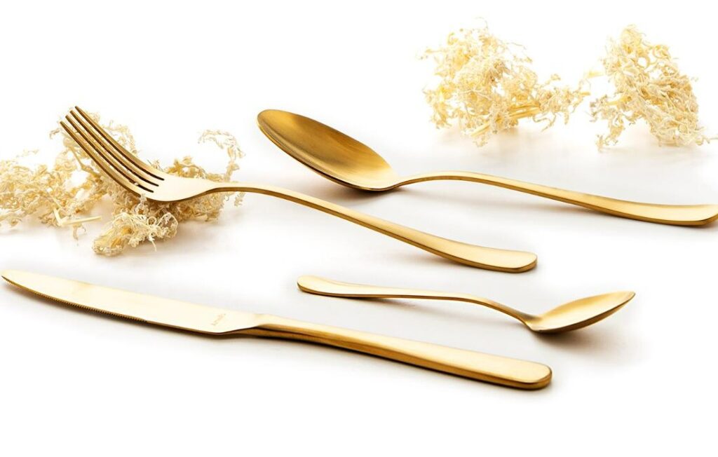 - Oro: es un material muy valioso y lujoso, utilizado para la fabricación de cubertería de alta calidad. Por su alto coste, no es muy conocido a nivel cotidiano. Además requiere un cuidado especial para evitar rayaduras y desgaste.