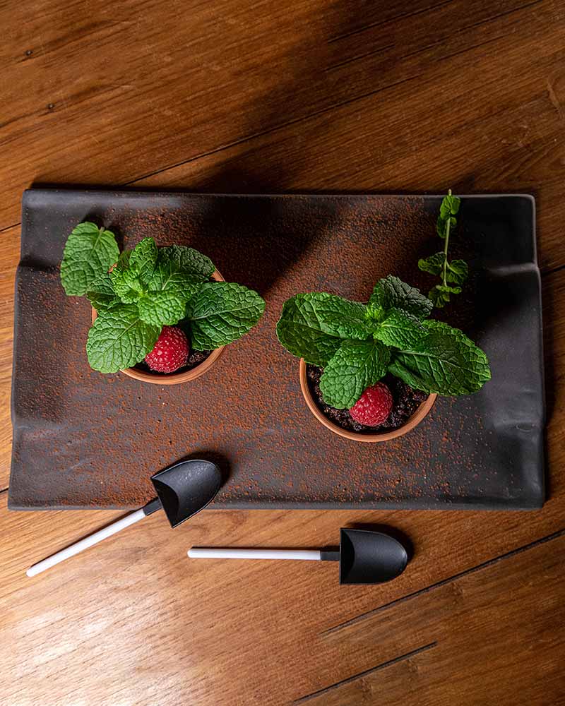 Una vez fría la mousse de chocolate repartimos por encima un poco de crumble desmenuzado imitando la tierra y decoramos con la ramita de menta y la frambuesa.