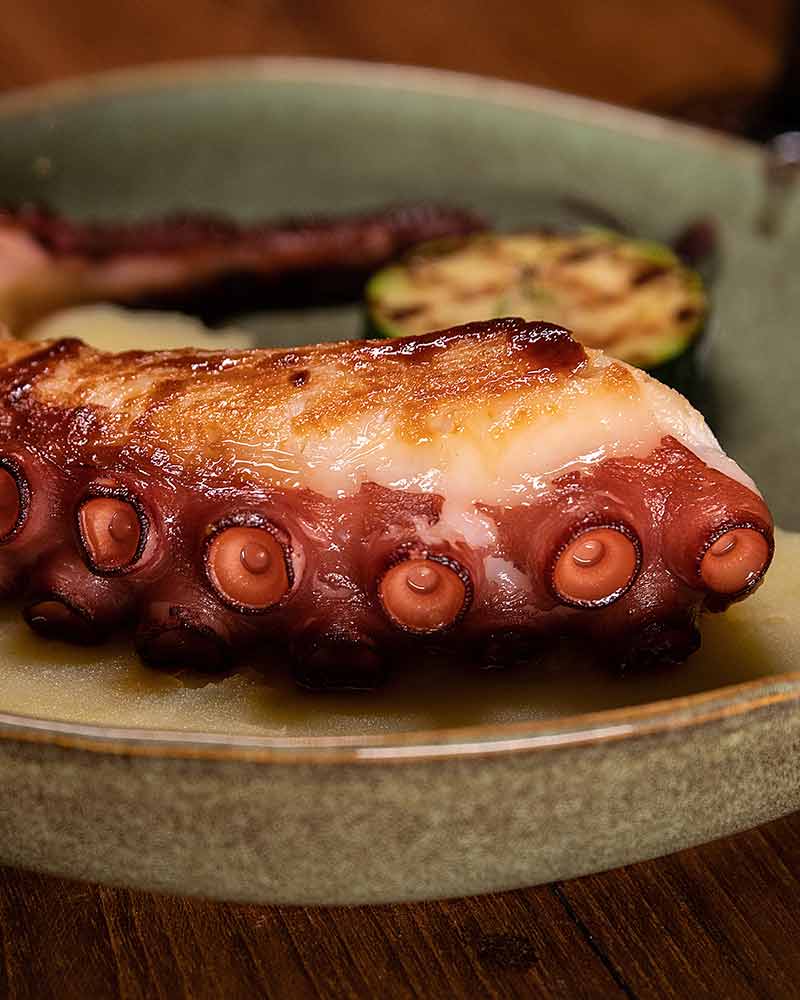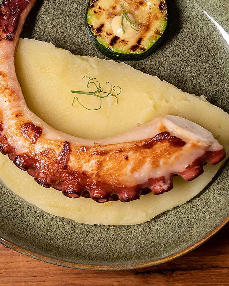 Pulpo a la brasa con parmentier de patata y calabacín