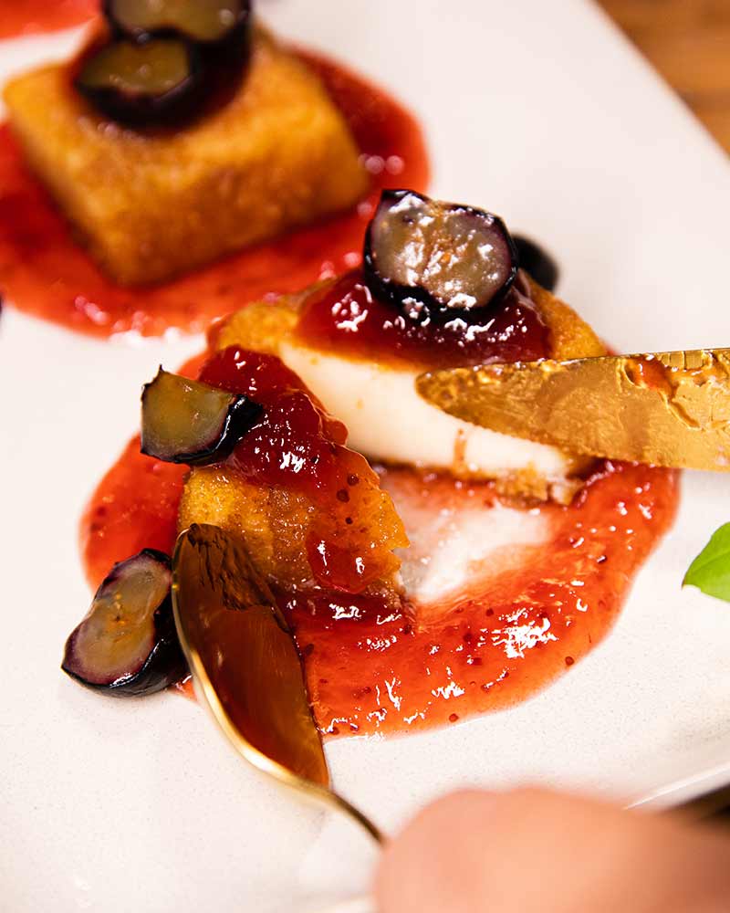 En una fuente rectangular, colocamos un aro y vamos rellenando con mermelada de arándanos tantas veces como piezas vayamos a servir, ponemos sobre ella la croqueta.