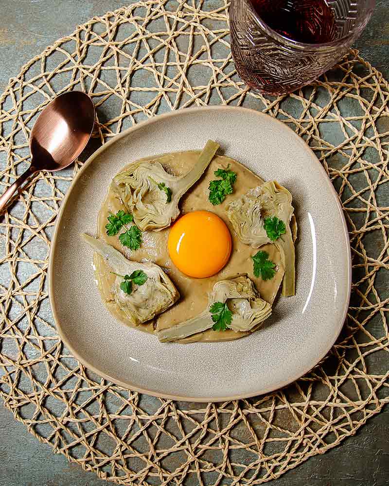 Elaboración de la receta de yema de huevo con alcahofa y puré de berenjena