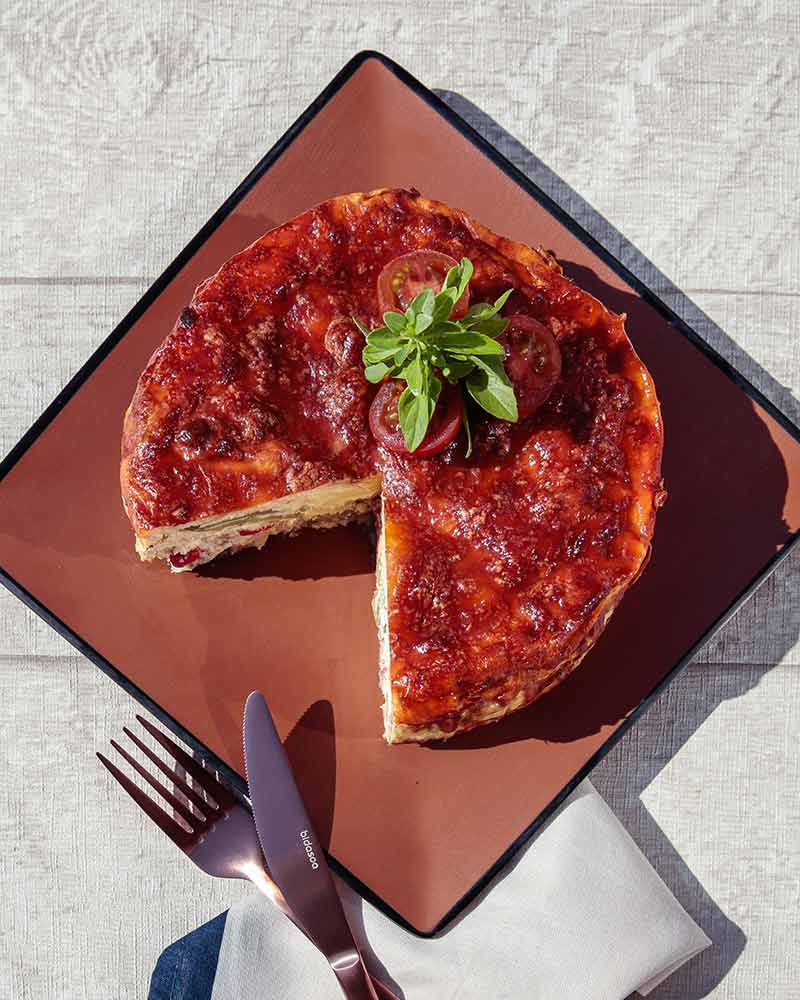 - Forramos con una hoja de papel de horno un molde de tarta desmontable y lo vamos rellénalo alternando capas de verduras asadas con la mezcla de queso y acabando con una capa de esta.